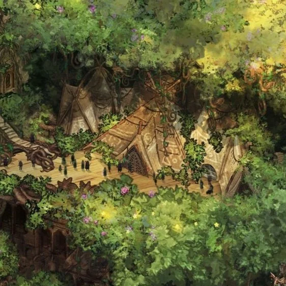 this was the second iteration, and the one i actually used for a while in my campaign before also deciding that i hated it. overall i think its servicable, but i realized the largest tree was the tree all the houses were on… not the tree the chieftan lived on. i really wanted to emphasize how special and important this one “father” tree is, and how lucky certain people are TO live on it.