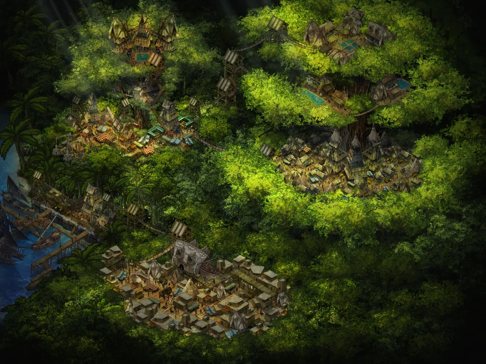 beyond that, the “undercity” feels like its not actually really under the trees everything else is on. everything also felt too spaced out. this is why i decided to go vertical with the aspect ratio for the current one — it’s supposed to be this clustered, vertical city, and this feels too sprawling to really convey the danger of the jungle below.