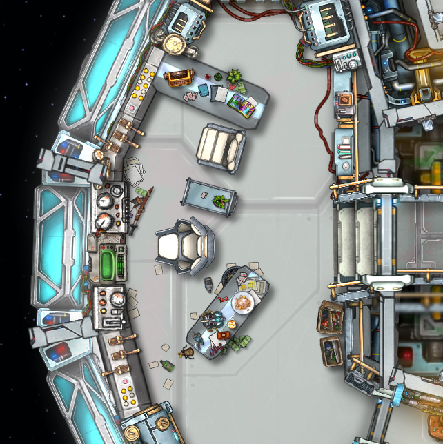this ship was designed for my wizard/blood hunter NPC who has founded the study of chronomancy and pioneered astral travel over her centuries of magically-prolonged life. Messy, sad, brilliant — the ship isn’t any sleek, modern Star Trek voyager. Monochrome monitors, buttons and levers are what conduct powerful magic, while the ship houses the quarters of a depressed genius.