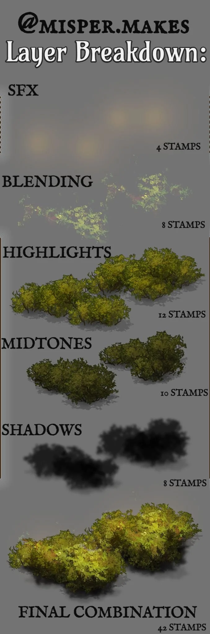 it was highly requested of me to share how i got the foliage to look the way it does in inkarnate. below is how i made all of my trees. i used the dead trees scaled really high as a “blueprint” for how a tree should be shaped, and then made my own tree trunks out of wood walls and my own foliage from layered bushes and lights. i really wanted it to feel painted, almost like hayao miyazaki’s style of foliage in movies like nausicaa and princess mononoke.