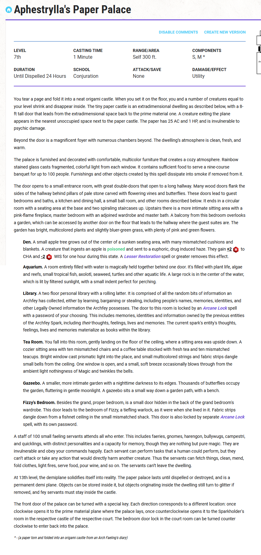 my player has a magic book (warlock) where she tears out pages and casts spells with them. This spell is cast by making a little origami palace that can be placed down. At first, the spell is temporary — when destroyed or ends, anything inside gets ejected. at higher level, it cemented itself in reality as a demi plane that they can visit at any time, though the origami entrance can still be destroyed.